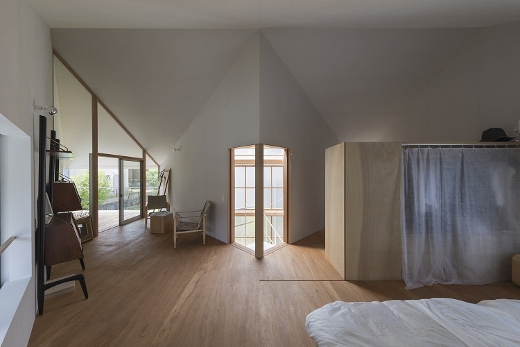 Con respecto al volumen de la casa, se utilizó una cuadrícula cuadrada simple y sus diagonales para crear los diferentes espacios, como uno que tiene un tamaño íntimo y otro que contiene un vacío espacioso. A cada uno de esto le colocaron espacios semi-exteriores.