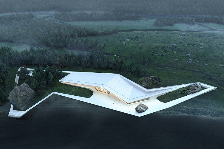 El hotel emerge de la cueva y de las terrazas hacia el agua. Vinculado íntimamente al paisaje, el diseño fue hecho para ser una síntesis de los montes Urales, la historia cultural y la arquitectura moderna.
