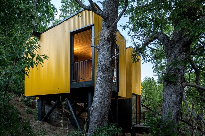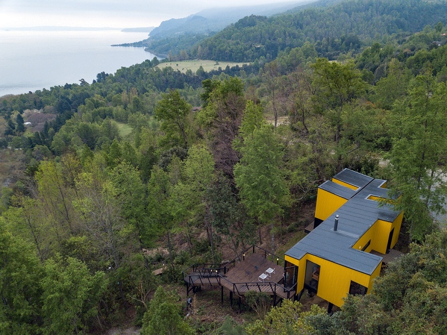 El arquitecto Alejandro Soffia construyó una residencia prefabricada en el bello bosque en Pucón, Chile, con una serie de módulos que cubrió con paneles corrugados de color amarillo brillante. Yellow House, así se llama el complejo que fue construido en secciones de varios tamaños para adaptarlo a las diferentes funciones de la residencia, incluida la cocina, sala de estar, biblioteca, el comedor, así como los dormitorios y baños.