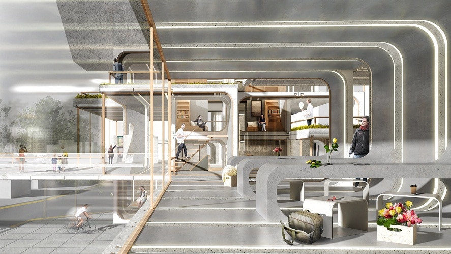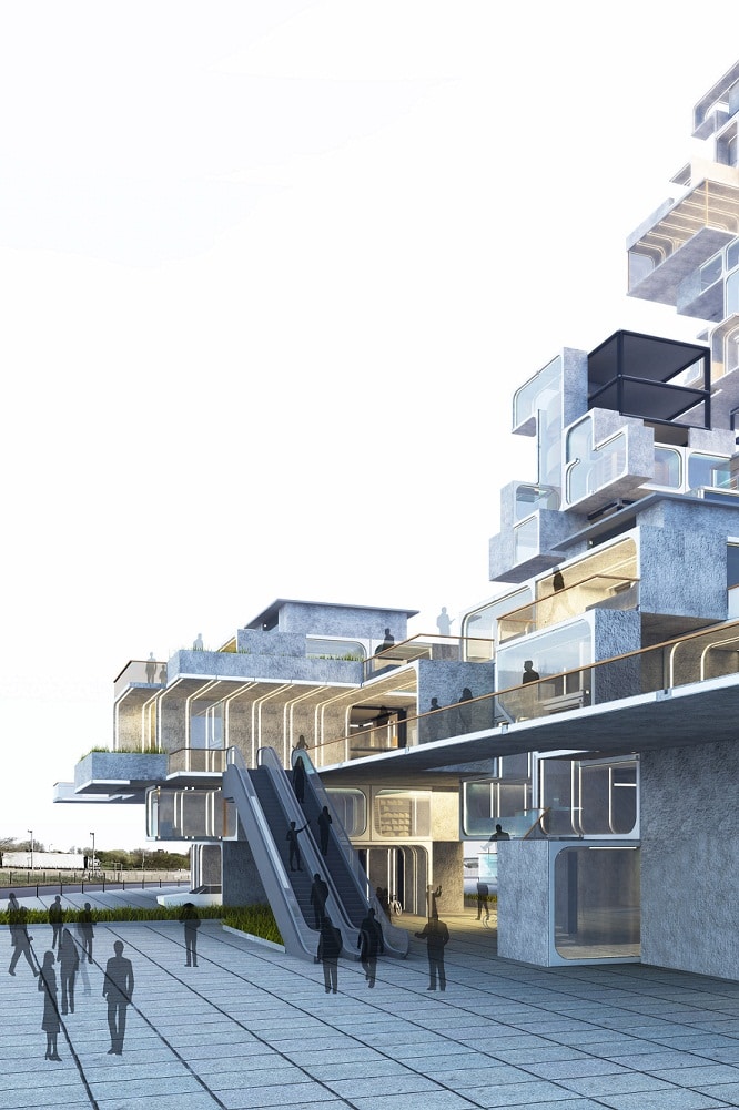 El proyecto de Wu, llamado ‘Beyond the Shell’ (más allá de la cáscara), reinventa la tradicional torre como un inmueble modular de varios pisos, con espacios públicos y privados de diferentes tamaños colocados uno encima del otro.