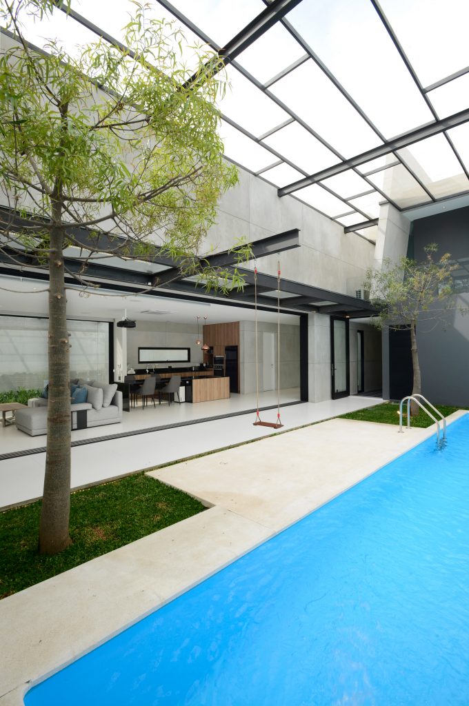 Hacia la parte posterior, estas paredes separan la sala de estar interna de la zona de la piscina con ventilación natural, con los dos espacios conectados abriendo una gran puerta corredera.