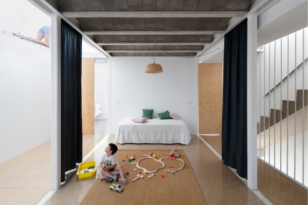 Llama mucho la atención cómo los pasillos laterales se levantan en forma de sacristía. Esto le permite darle diferentes usos dependiendo de cuánto vaya creciendo la familia, siendo completamente diferente a cualquier vivienda tradicional.